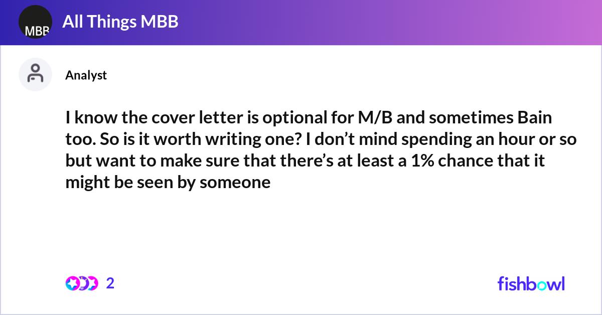 A great cover letter can help you to get an interview at top consulting firms. Are you wondering if it's good enough? Easily write a cover letter by we have 100+ cover letter examples by type and industry to help you make your cover letter persuasive. *** successful bain cover letter contributed by a cover letter library member for bain & company associate consultant *** bain cover letter november 1, 2015 to whom it may concern, re: So let's step and let's also review a cover letter sample that landed interviews with mckinsey, bcg and bain. So if you're writing a cover letter for a bain job, what should you write to demonstrate you know not only a lot about the firm but something interesting that distinguishes it from the rest? Consulting firms selected which primary candidates that they wanted to interview from the. Learn the three components to a good close, and read our tips on how how to write an awesome cover letter closing. My thinking on cover letters is that if you have something substantive to say, include it. Cover letter format choose the right cover letter format for your needs. Via venngage as with any piece of writing, a compelling headline helps to immediately capture the reader's attention. View a real cover letter for the bain & company full time position, associate consultant. Consulting cover letters are different to other cover letters. It puts the work experience yes, you read that right. Cover letter format pick the right format for your situation. In this video you will learn how to write the perfect letter to get interviews at mckinsey, bcg and bain. By robert half on august 5, 2020 at 4:45pm. Between a resume and cover letter, most job applicants will tell you that the resume is more important. Application bain bain & company bcg cover letter mckinsey mckinsey & company needhelp tips. Cover letters should be around three paragraphs long and include specific examples from your past the following cover letter samples and examples will show you how to write a cover letter for many. With a great cv, your consulting cover letter can open the door to scoring an interview and thus, in this article i'll show how to write a persuasive and customized cover letter that will move your job. How to write a cover letter learn how to make a cover letter that. The most important thing you need to remember for this section is accuracy. Hey, sure i can send my old cover letter from when i applied. Your cover letter closing matters. The cover letter becomes an important data point on how good they are at certain skills that might be bain uses cookies to improve functionality and performance of this site. A cover letter for your cv, or covering note is an introductory message that accompanies your cv this guide, with 12 annotated cover letter examples will show you everything you need to know. A great cover letter can help you to get an interview at top consulting firms. Cover letter examples see perfect cover letter samples that get jobs. The complete guide to writingthe perfect cover letter (2020 update) . Cover letter templates find the perfect cover letter template.