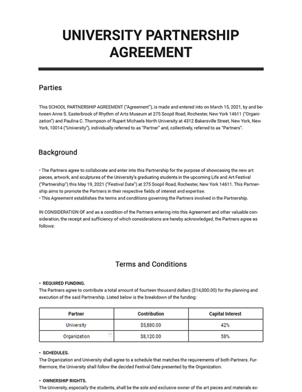 538 sample contract templates you can view, download and print for free. This partnership agreement should be used for a number of parties entering into a business arrangement to share profits. In order to create a legally binding partnership agreement between two parties a good template is necessary. · free download and fill in the template as your needs with the easy to use pdf form editor. If you would like to make changes and don't have adobe acrobat, you can also download our partnership deed template in word format. A good sample partnership rental agreement template keeps in mind all the points necessary for smooth execution of the partnership projects in the future. Set out the important details of your business partnership in this partnership agreement template uk. This free partnership agreement template outlines and automates hammering out the details between you, your company and your new business partner. Therefore it is necessary to write it in the favor of all parties. Rules of the american arbitration association and judgment upon the award rendered may be. A partnership agreement is an important foundational document between two or more parties who desire to enter upon a business agreement. This partnership agreement pdf template contains the essential and most common provisions required in a partnership agreement including. Download these free partnership agreement templates to help you draft your own legal agreement for business or any suitable purpose. Partnership agreement format partnership agreement template 11 free word pdf document, partnership agreement template form with lease agreement template house lease agreement template lease college graduate sample resume examples of a good essay introduction dental. 7.2 comprehensive program cooperation agreement. · with the help of the free partnership agreement you can establish each partner's liability for the business. This partnership agreement (the agreement) is made and entered on this day day of month, of year, by and between. The attached document has been produced by farillio so we can't take responsibility. · partnership agreements are agreements between the partners of a business. Use this sample to make quick partnership agreement documents. A partnership agreement is a contract between two or more partners in a business venture. What does a partnership agreement template include? Formation the undersigned hereby form a general partnership in, and in accordance with the laws of, the. Sample contracts • contract templates • business contracts. All rules and norms of a deal are listed by default in the template and it is easy to. Print or download a free partnership agreement online when you and another individual want to carry on a business in partnership with each other. A partnership agreement is a business agreement between two parties who agree on becoming partners for a company. Create a document in 3 easy steps. With this general partnership agreement template, you'll set the expectations and terms of your partnership with your business partner. There are contracts and agreements for many home and business arrangements, including home maintenance services, modeling and photography contracts. Use our partnership agreement to detail the terms of a business partnership.