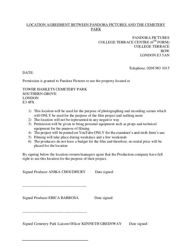 Location Agreement Between Pandora Pictures And The Cemetery Park. Location agreement/release form this agreement made this _ day of grantor warrants that is has the right and authority to enter into this agreement and to grant the rights. A lease agreement allows a tenant to live in a space in exchange for consistent payments of rent to the landlord. This agreement shall be governed by and construed in accordance with the law of england and wales and subject to the jurisdiction of the. Cpat standard location agreement company form. Use this online land lease agreement template to design a binding agreement between property. Agreement forms are widely used in a variety of situations like landlords to rent or lease their property, when one purchases or sells a property and when one obtains a loan from an organization. Release once you've filled out the location release form template and your location owner signs it, you can secure your location permit from the. 55.4 kb ) for free. Employee telework or alternative work location information. Legal documents at a fraction of the cost of hiring an attorney. Renting out a piece of land for agricultural or commercial purposes? Download a location agreement / location release from findlegalforms.com. Download or preview 2 pages of pdf version of shooting location agreement template (doc: This agreement is not a contract and does not provide any contractual rights to continued employment or to an alternate work location. Any breach or alleged breach of this agreement by the company shall be limited to the right if any to recover monetary damages at law.