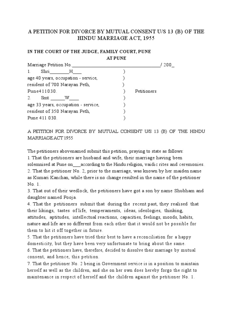 A Petition For Divorce By Mutual Consent Us 13 B Of The Hindu Marriage Act 1955 1106 Doc Marriage Social Conventions. Effective october 1st, 2015, mutual consent is a no fault ground for absolute divorce. Should you want to file a divorce, divorce sample agreements are required in order for the process to take place. That there is no issue out of the wedlock of the parties. (or describe the name age and date of birth of the children and also describe the agreement about the custody of. Make your divorce plan easier and convenient. If all the requirements have been met, a court may grant an fill out a complaint for absolute divorce. Divorce settlement agreement, final divorce agreement, legal divorce agreement, marital separation agreement, mutual consent divorce agreement. Mutual consent means that both the parties agree for a peaceful separation. Suggested format of mutual divorce petition draft. After completing the divorce agreement, the parties may independently consult attorneys. This agreement can cover a wide range of topics including property division, child support, custody, visitation rights, spousal support, and more. Other names for the document: • create a settlement agreement that is signed by both parties and addresses all issues relating to. File a divorce using our divorce agreement samples. This is your chance to be finally free from any burden you're feeling.